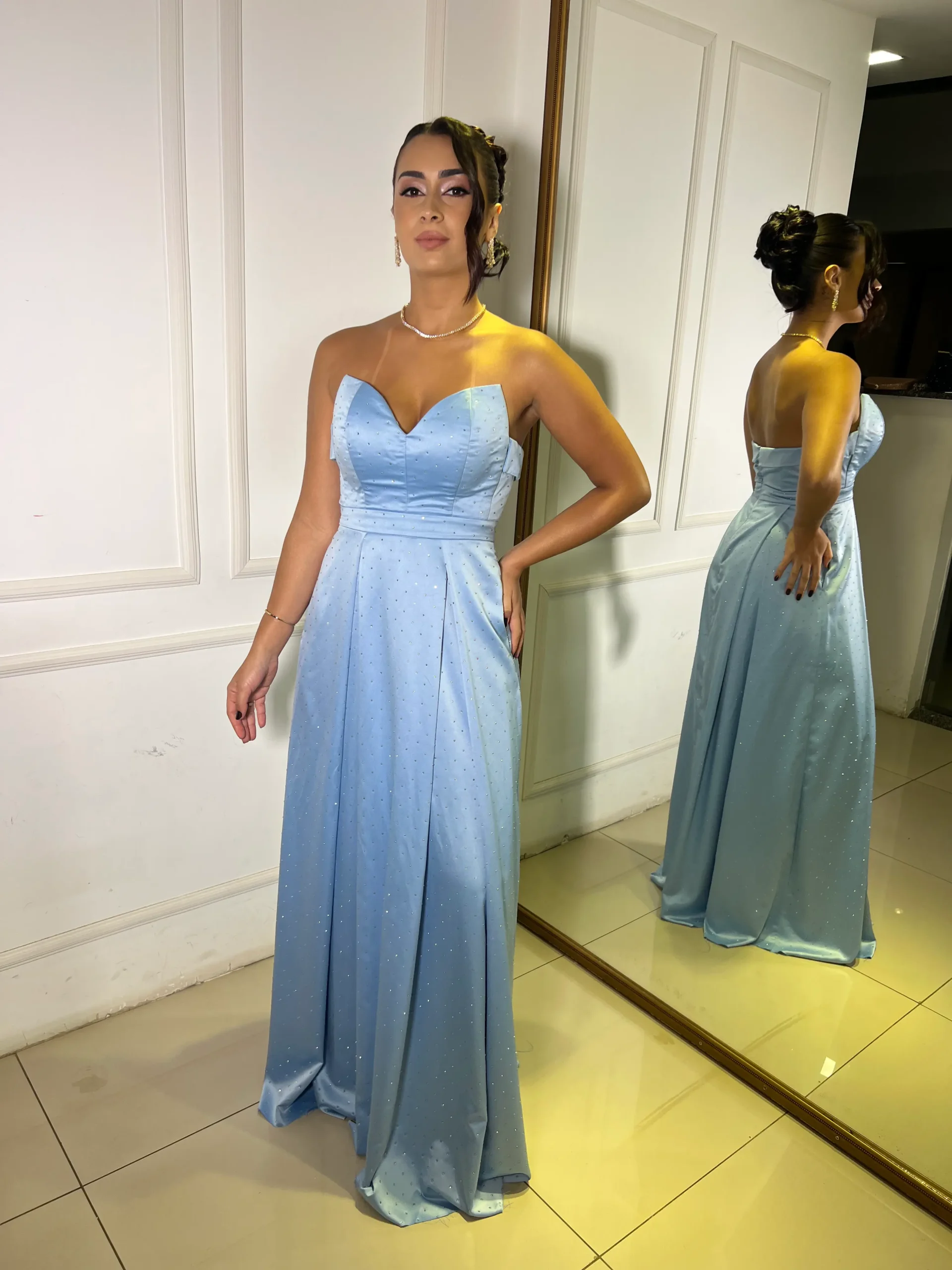 Vestido em crepe acetinado, com pontos de luz do próprio tecido, peito em formato coração e super estruturado: não cai!!!!