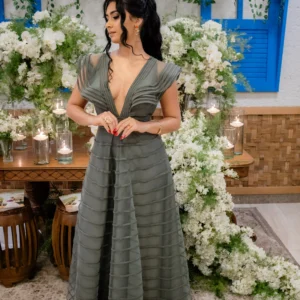 Vestido em zibeline, saia volumosa, idela para aquelas com pouco quadril, fenda transpassada que pode ser fechada na altura desejada.