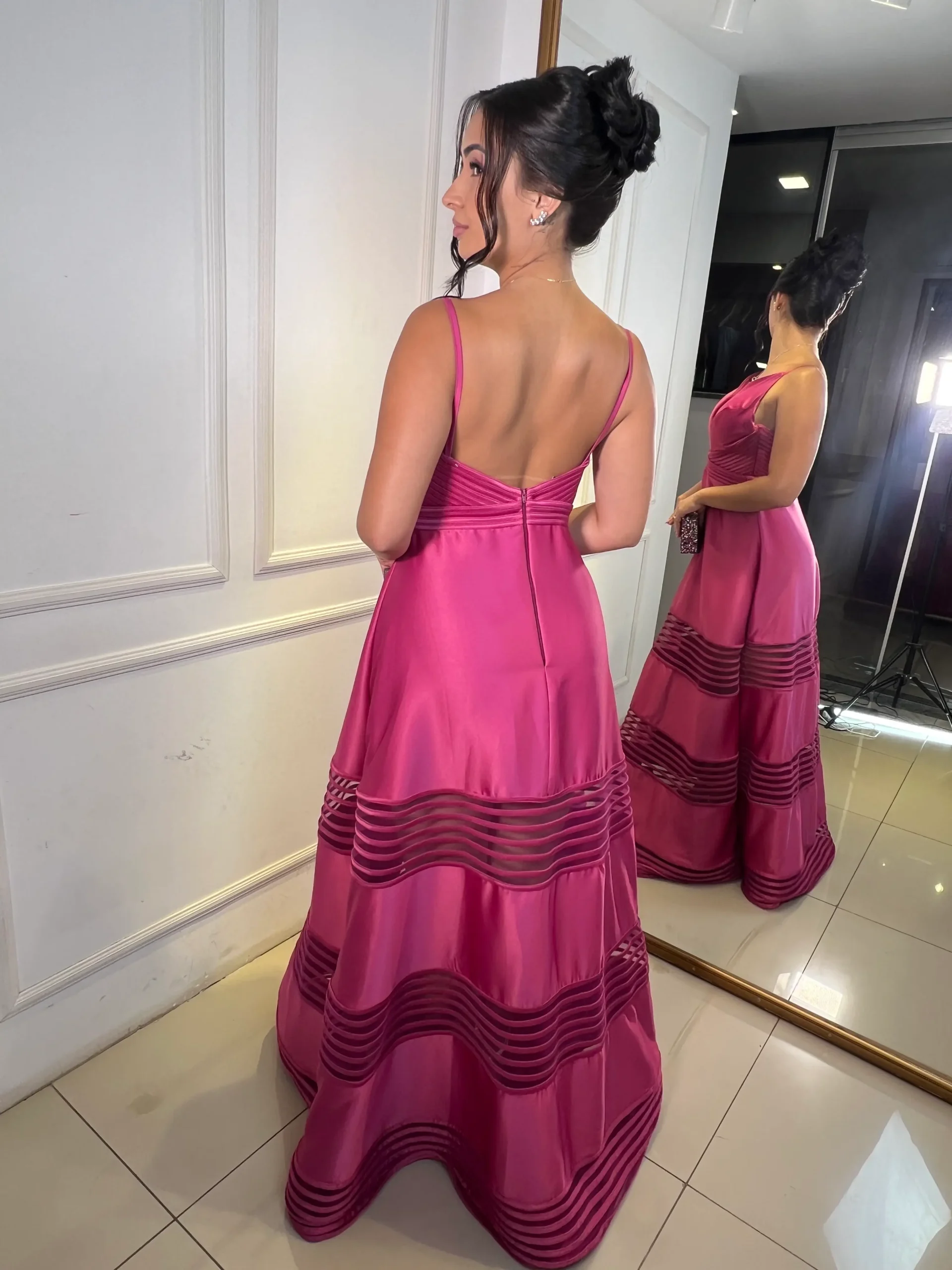 Vestido em crepe acetinado, com saia godê e detalhes em tule e em tiras.