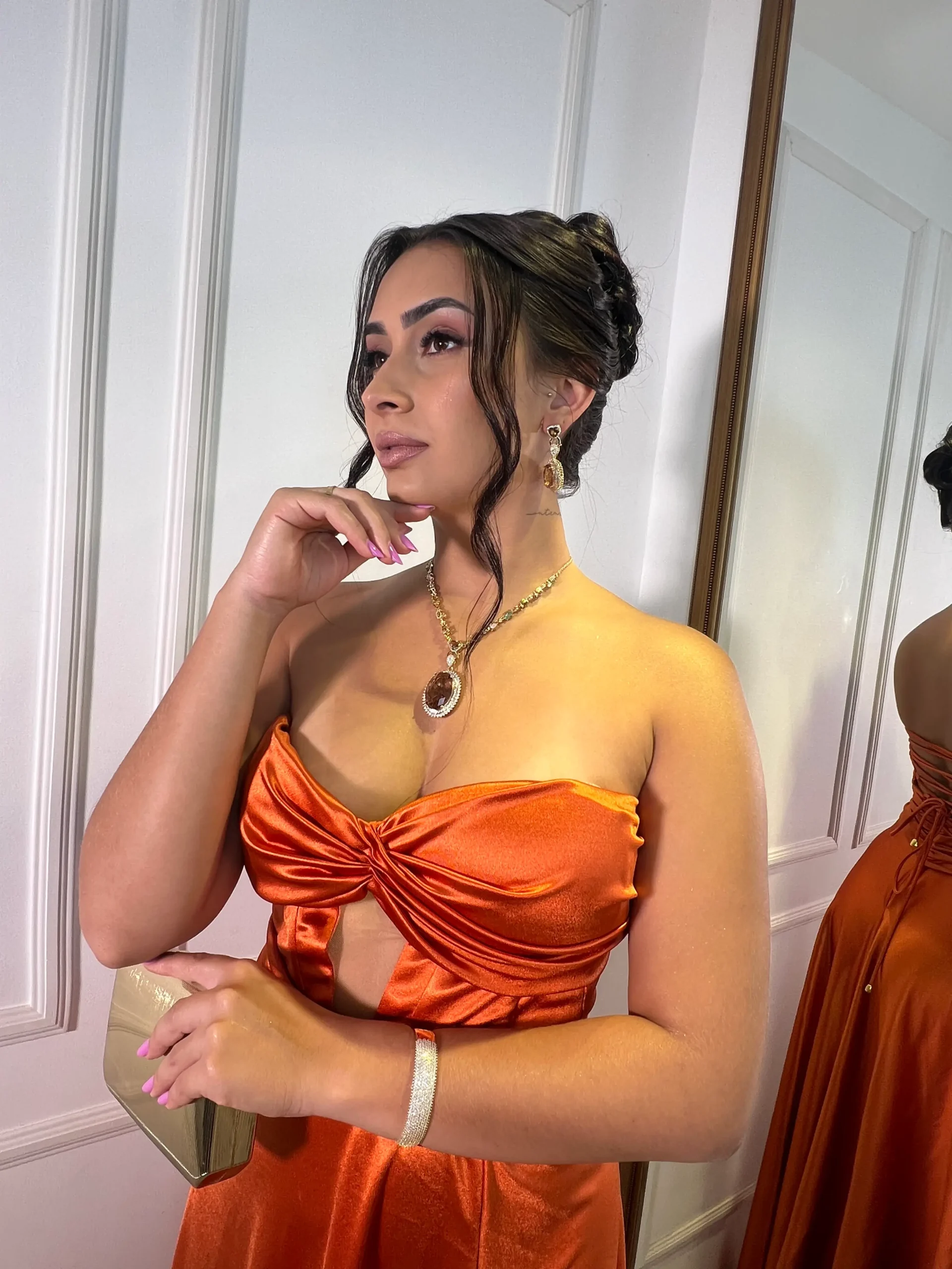 Vestido em malha acetinada, grossa e com excelente caimento, fenda poderosa que pode ser fechada na altura desejada.
