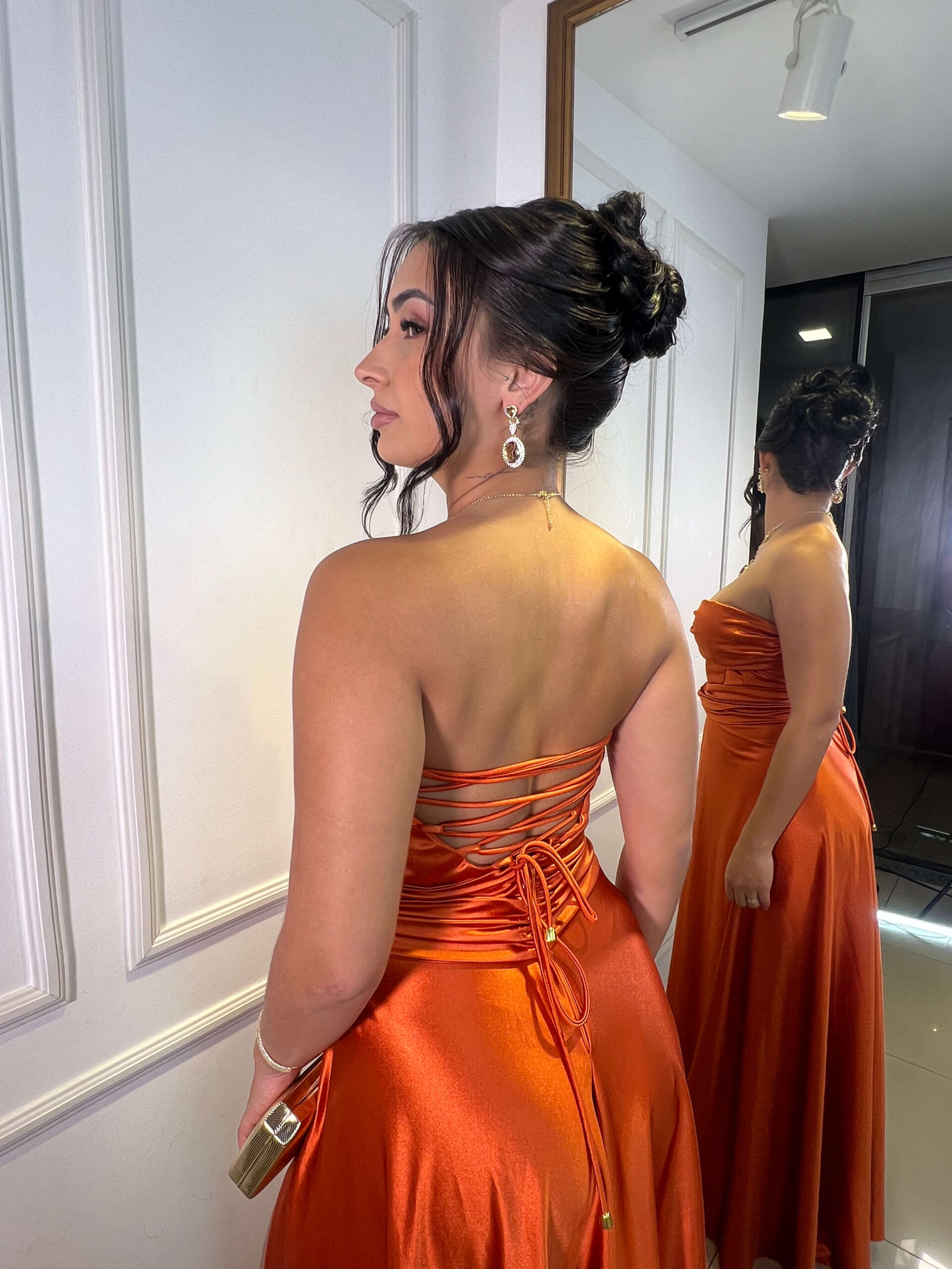 Corset estruturado com barbatanas, tule e drapeado, costas com amarração, que ajuda no ajuste do vestido no corpo.