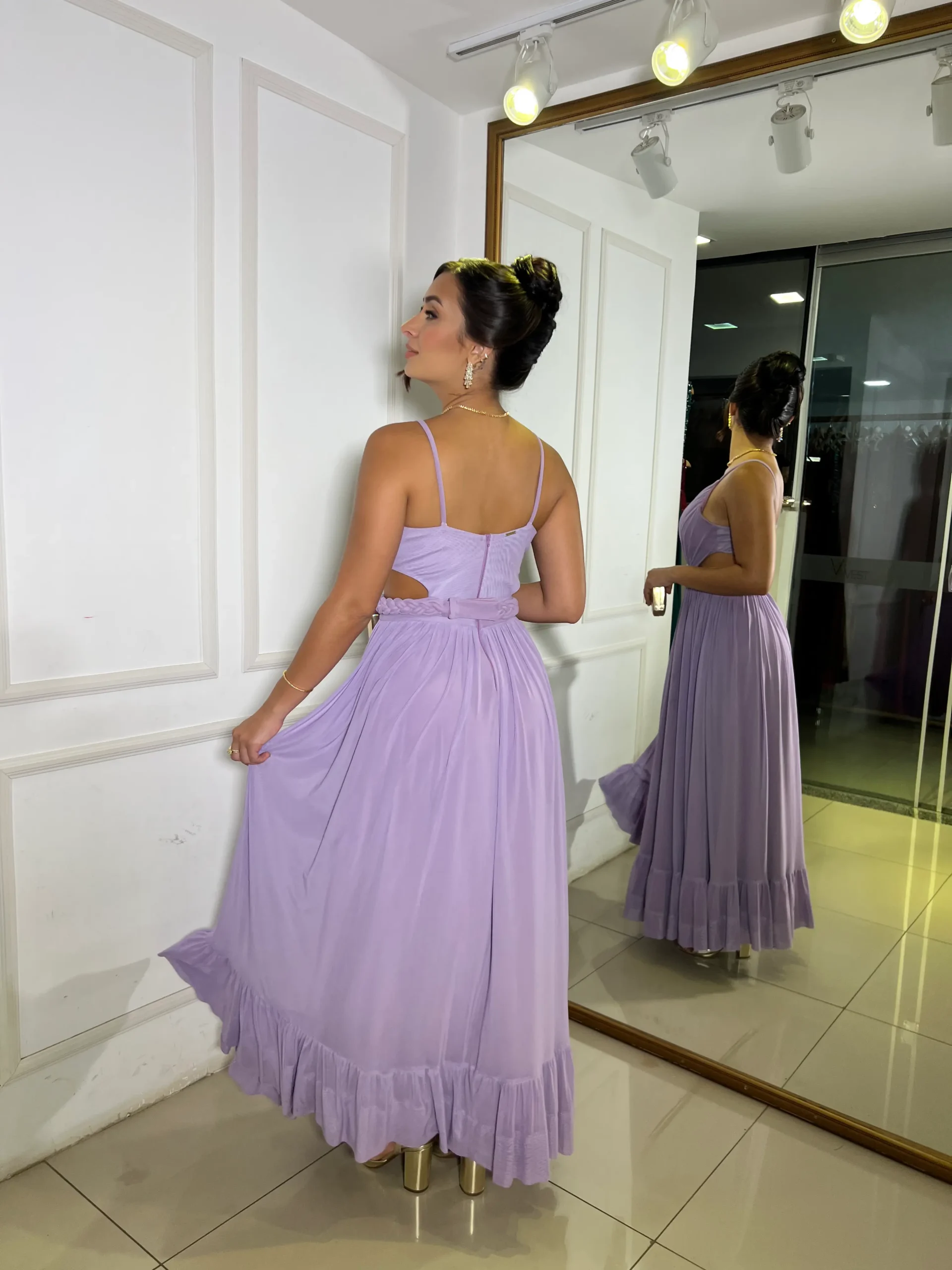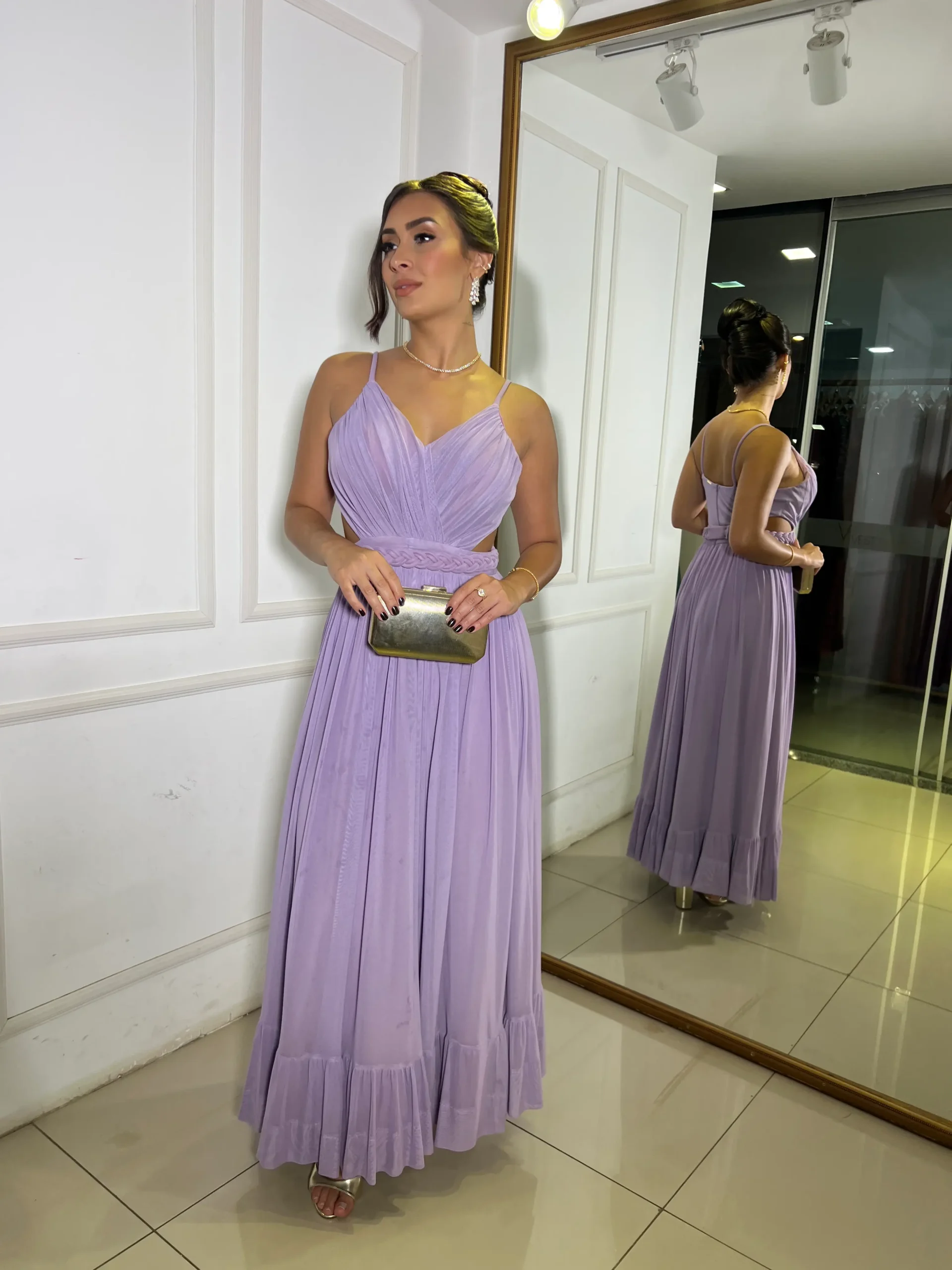 Possui drapeado no busto e decotes na cintura, acompanha um cinto trançado que pode ser opcional.