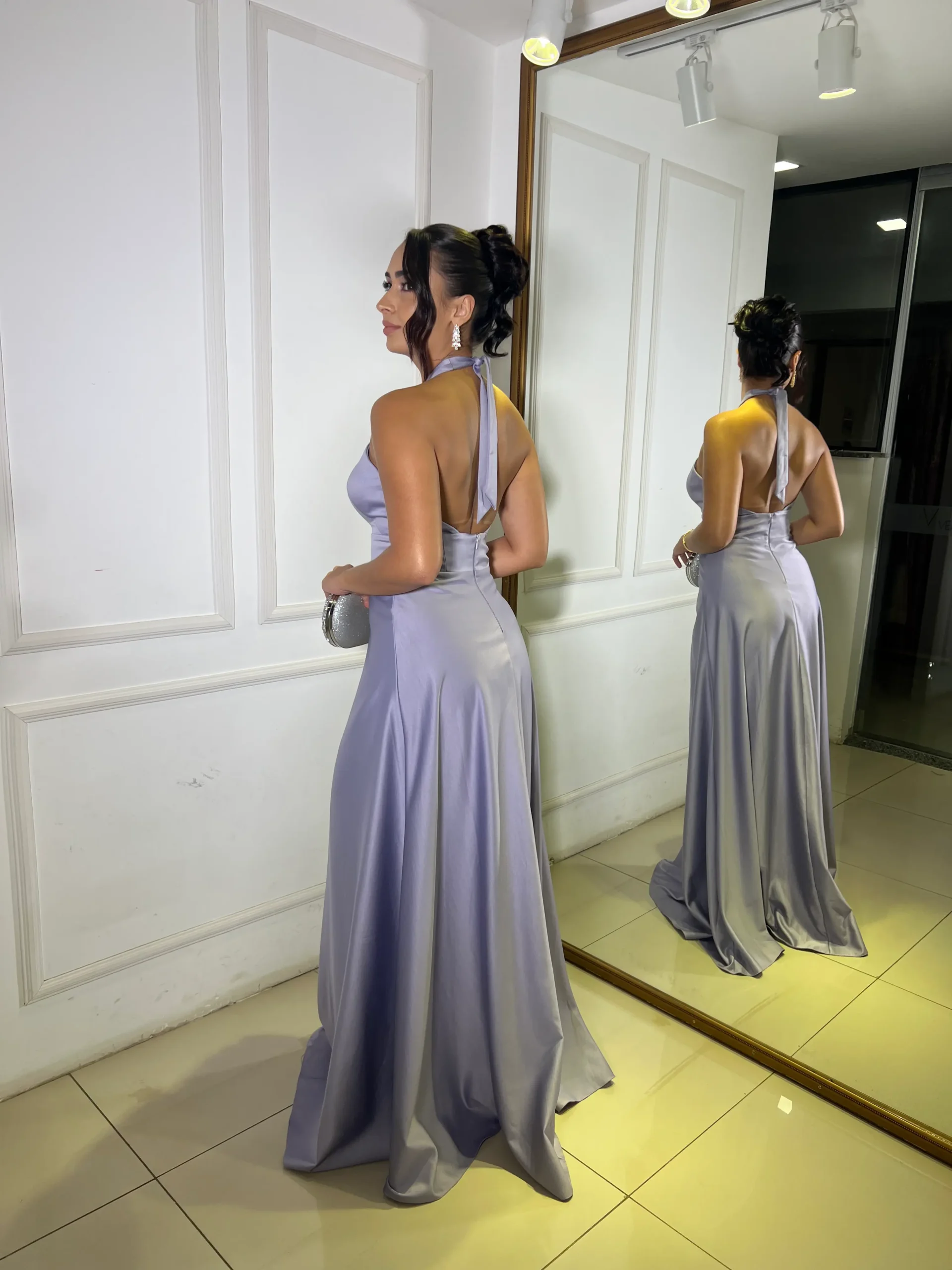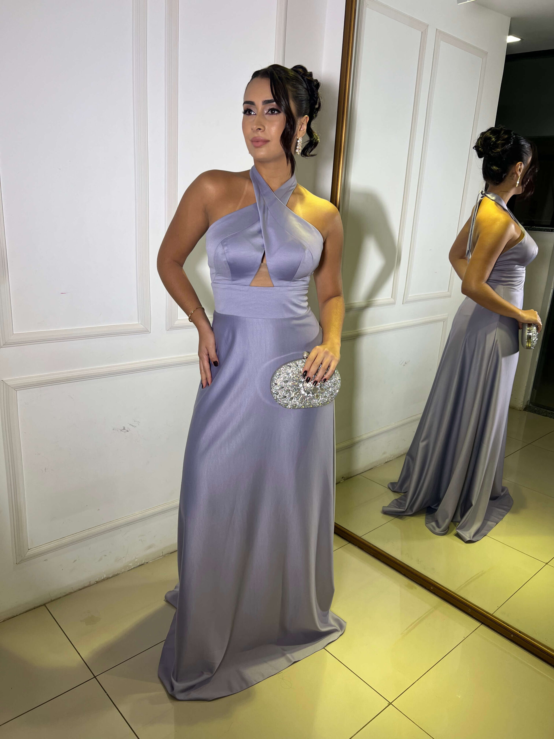 Vestido em crepe acetinado, saia godê simples, que tem aquela modelagem elegante e sai da cintura mais retinha e abre apenas em baixo, é uma peça com o cós largo, marcando a cintura, um decote cruzado com recortes e costas frente única, um clássico chique!