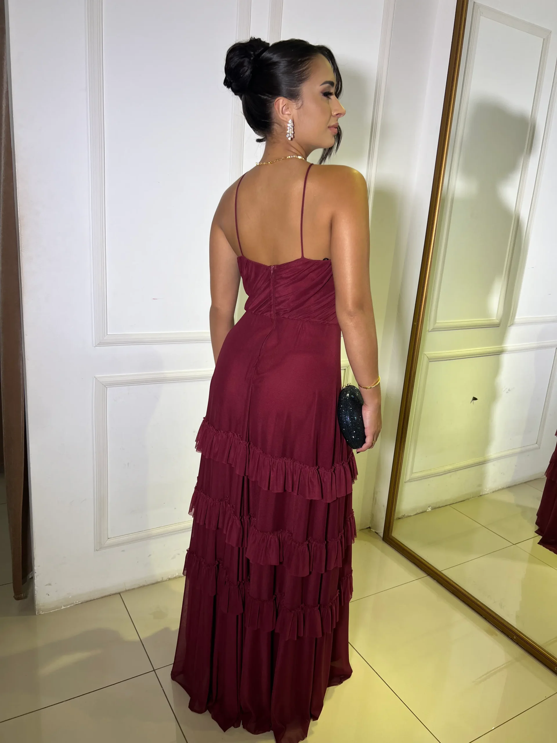 Vestido de microtule e forrado, saia godê simples com babados, corpete drapeado com bojos espaçados.