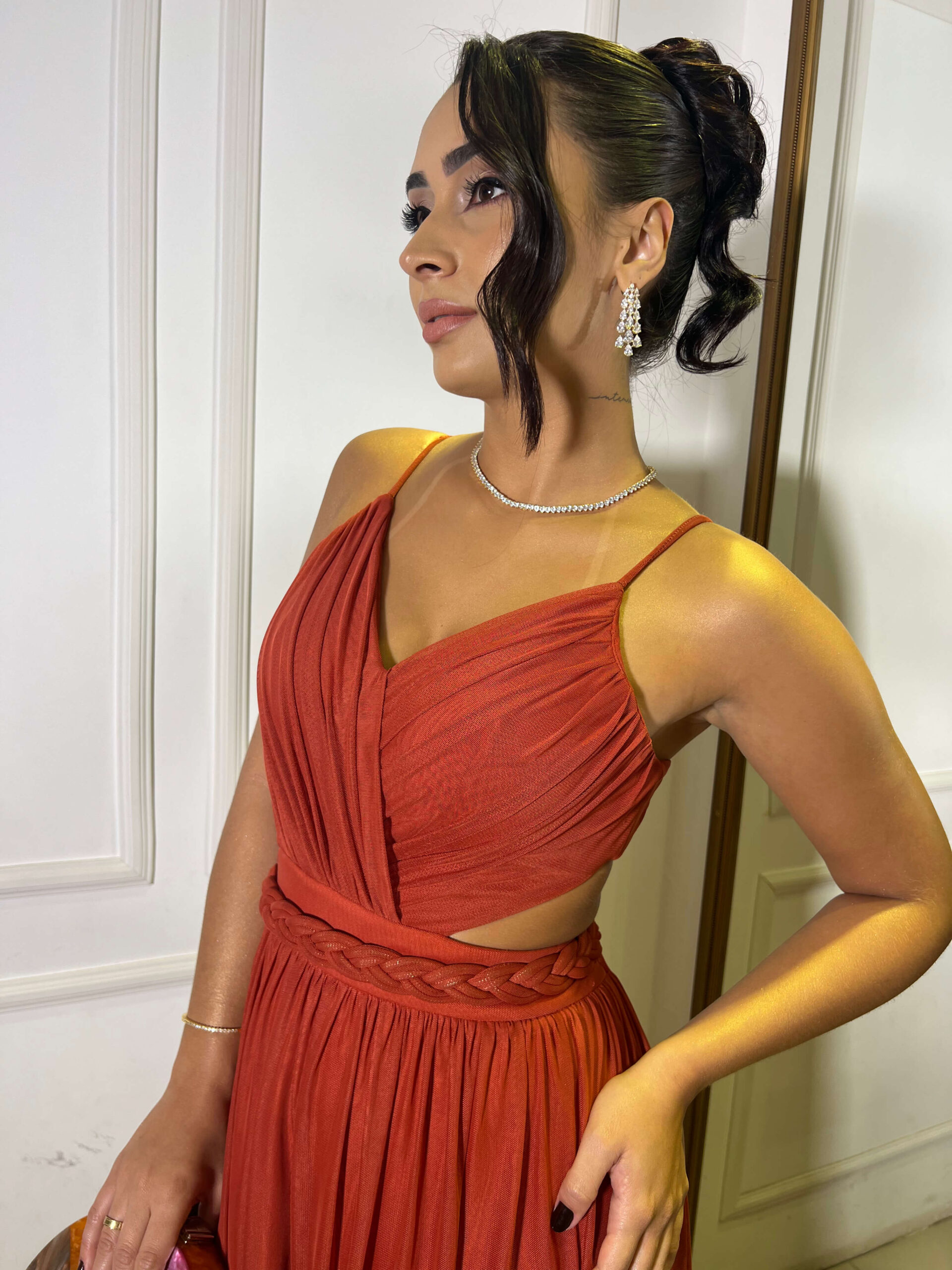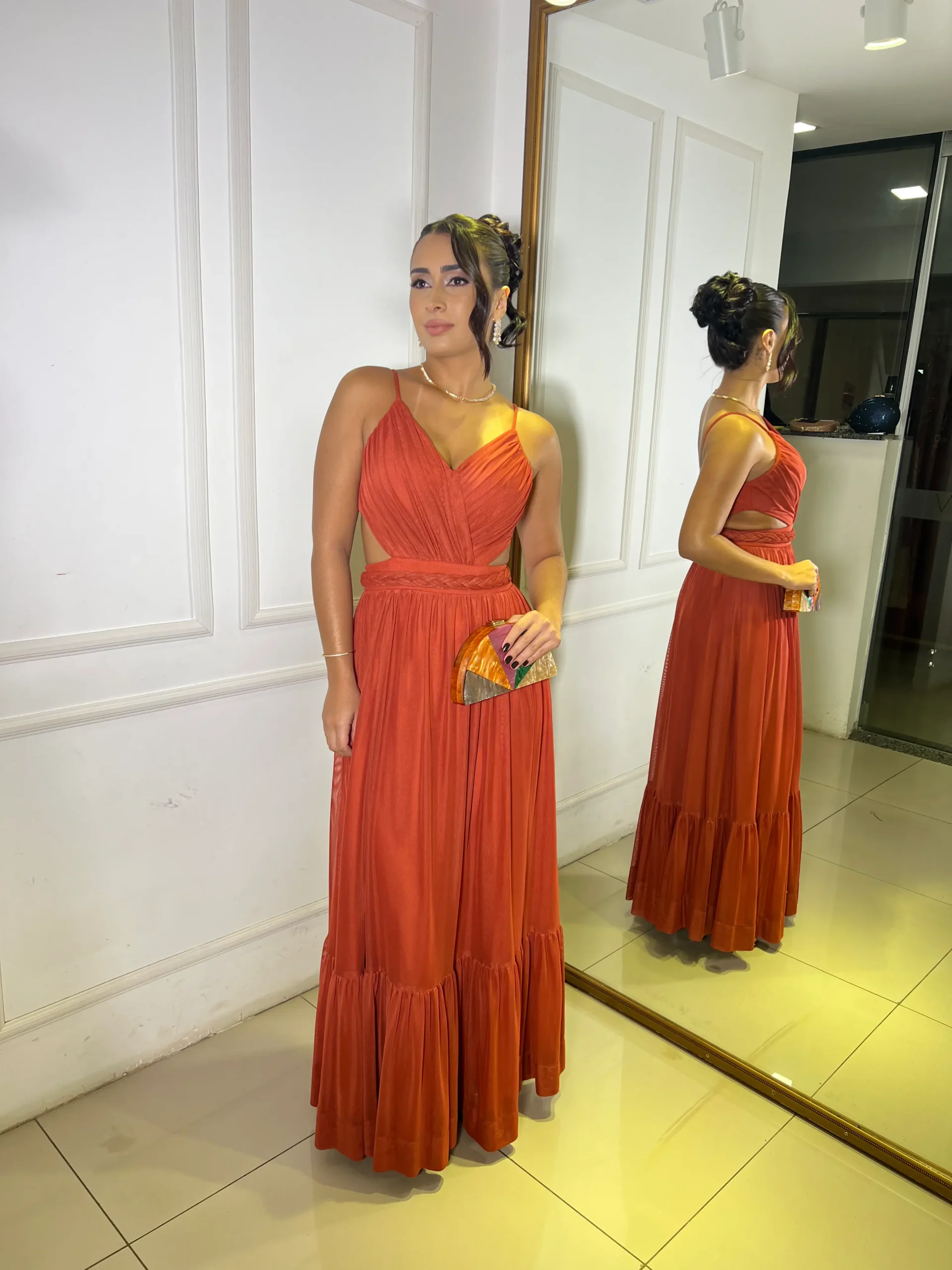 Possui drapeado no busto e decotes na cintura, acompanha um cinto trançado que pode ser opcional.
