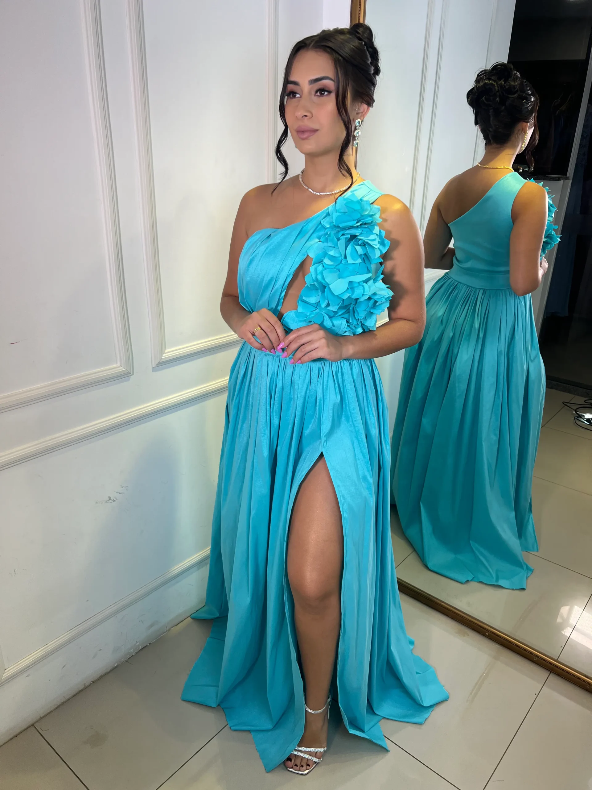 Saia franzida com fenda e corpete de 1 ombro com aplicações em flores.