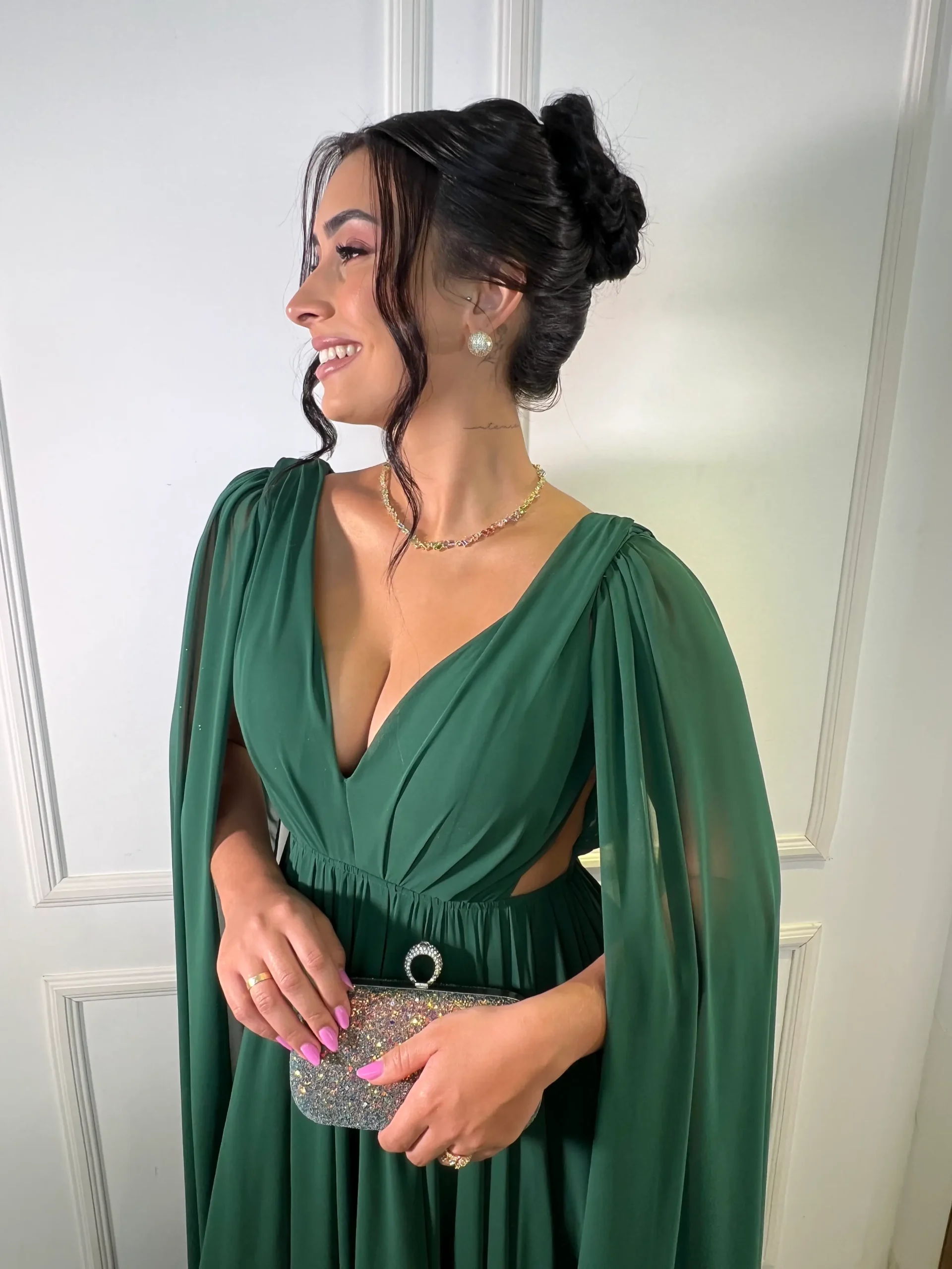 Vestido em musseline de seda, saia fluida e com bastante movimento, recortes com tule na cintura, decote com leve drapeado até a cintura, capas longas com botões de pressão, que podem ser usadas com ou sem ou retiradas durante a festa.