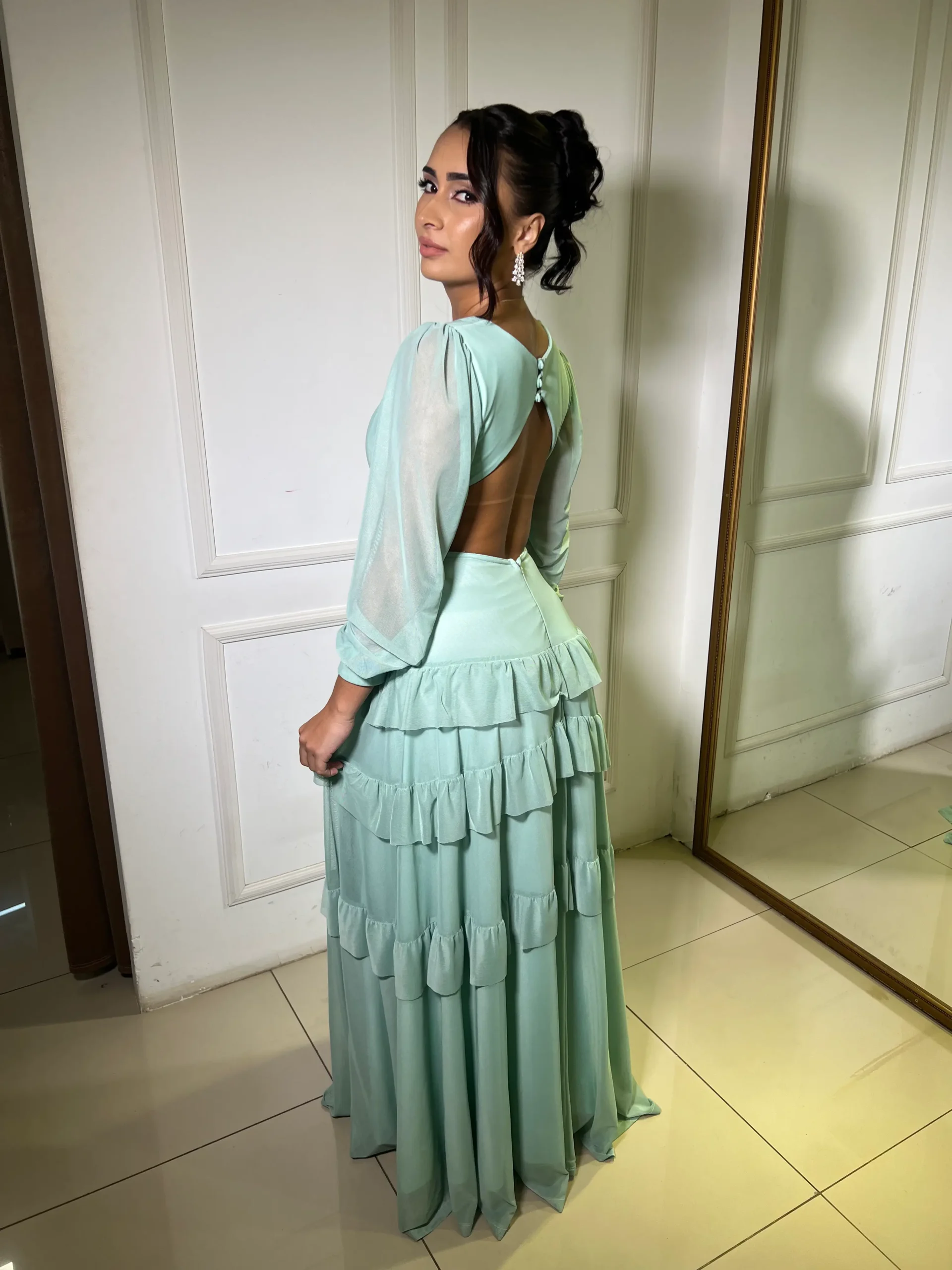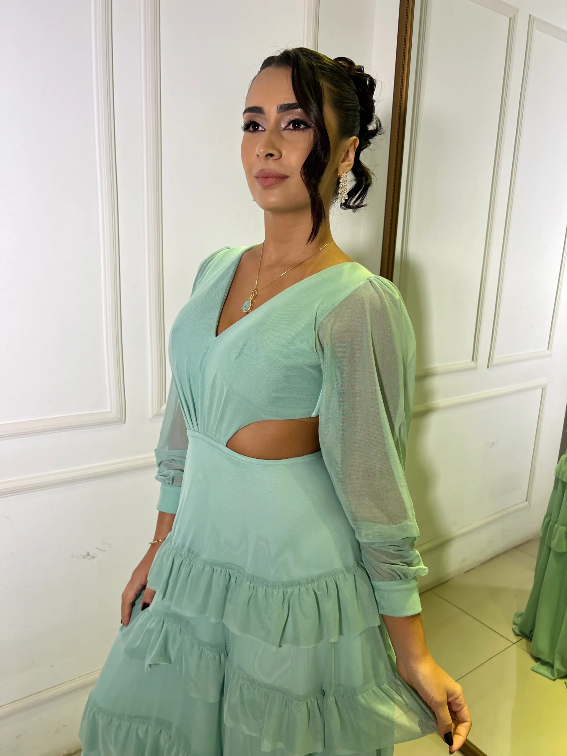 Vestido em micotule, forrado com helanca, saia godê com babados, recortes na cintura e decote nas costas, acabamento com botões encapados nas costas e nos punhos, pode ser vendido com ou sem mangas.