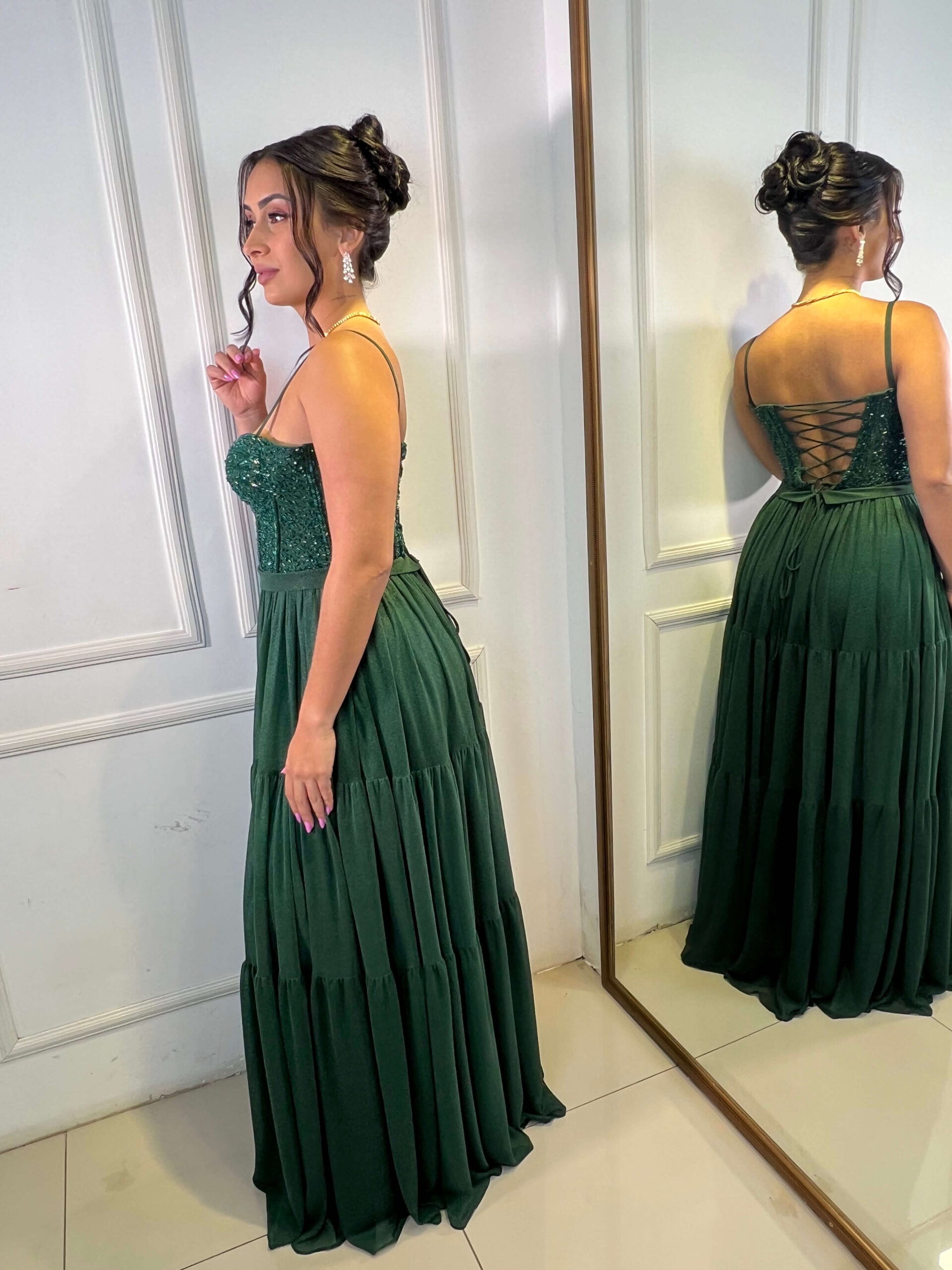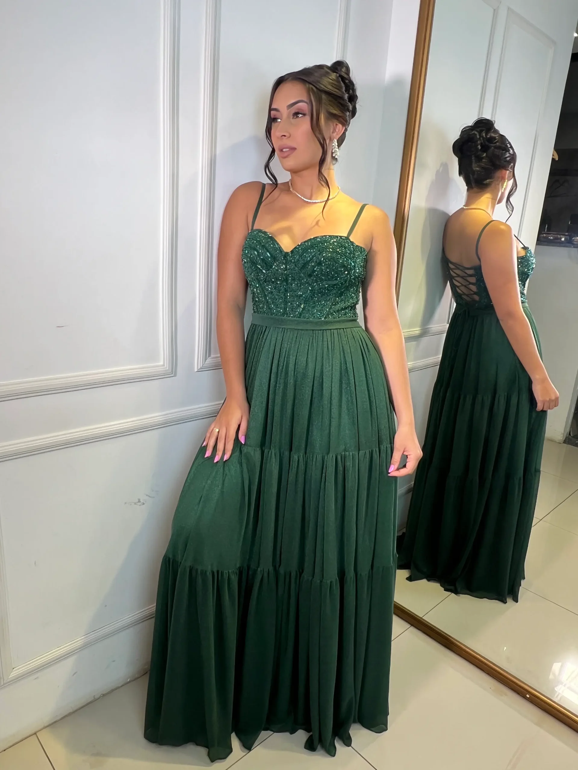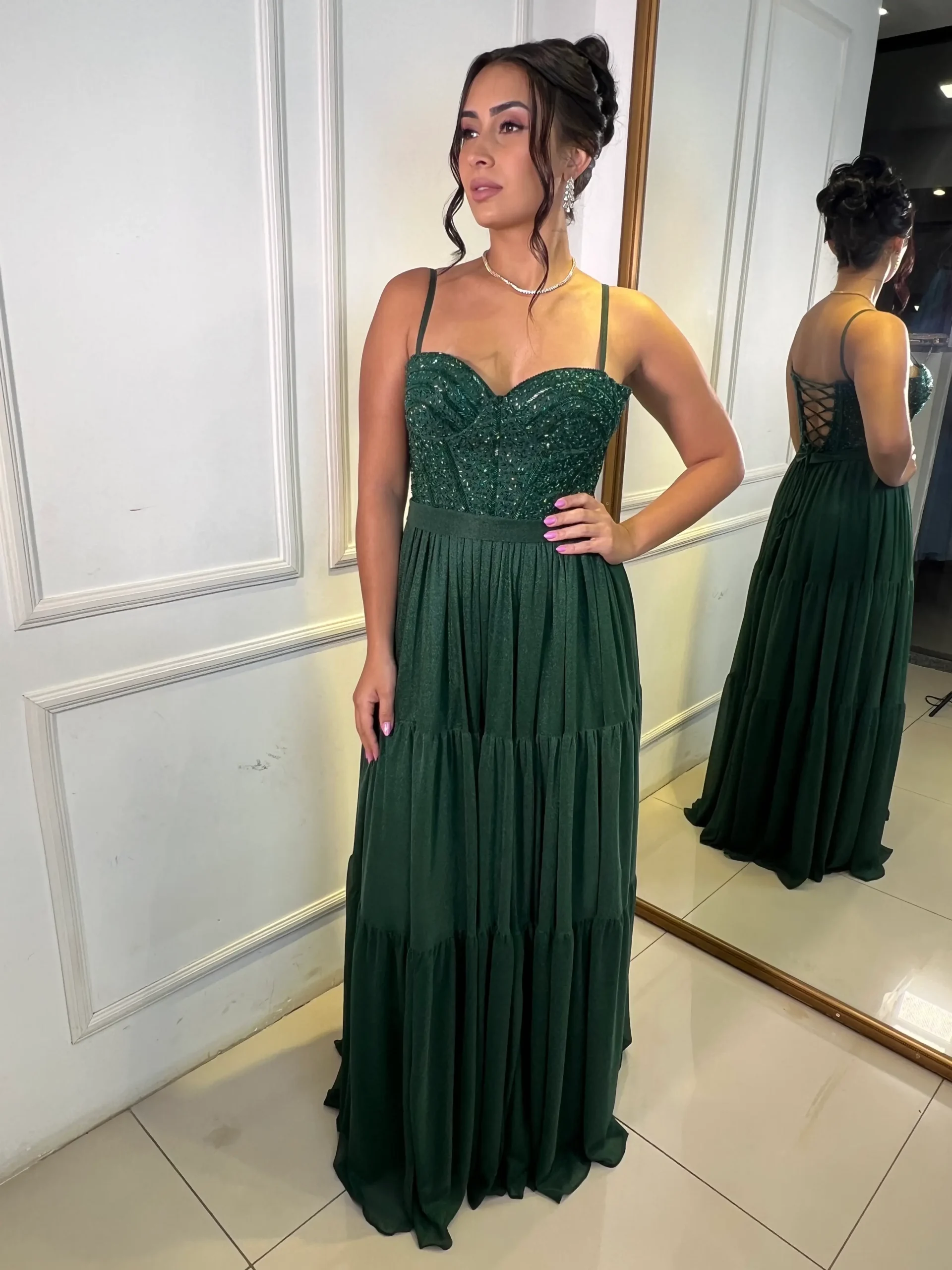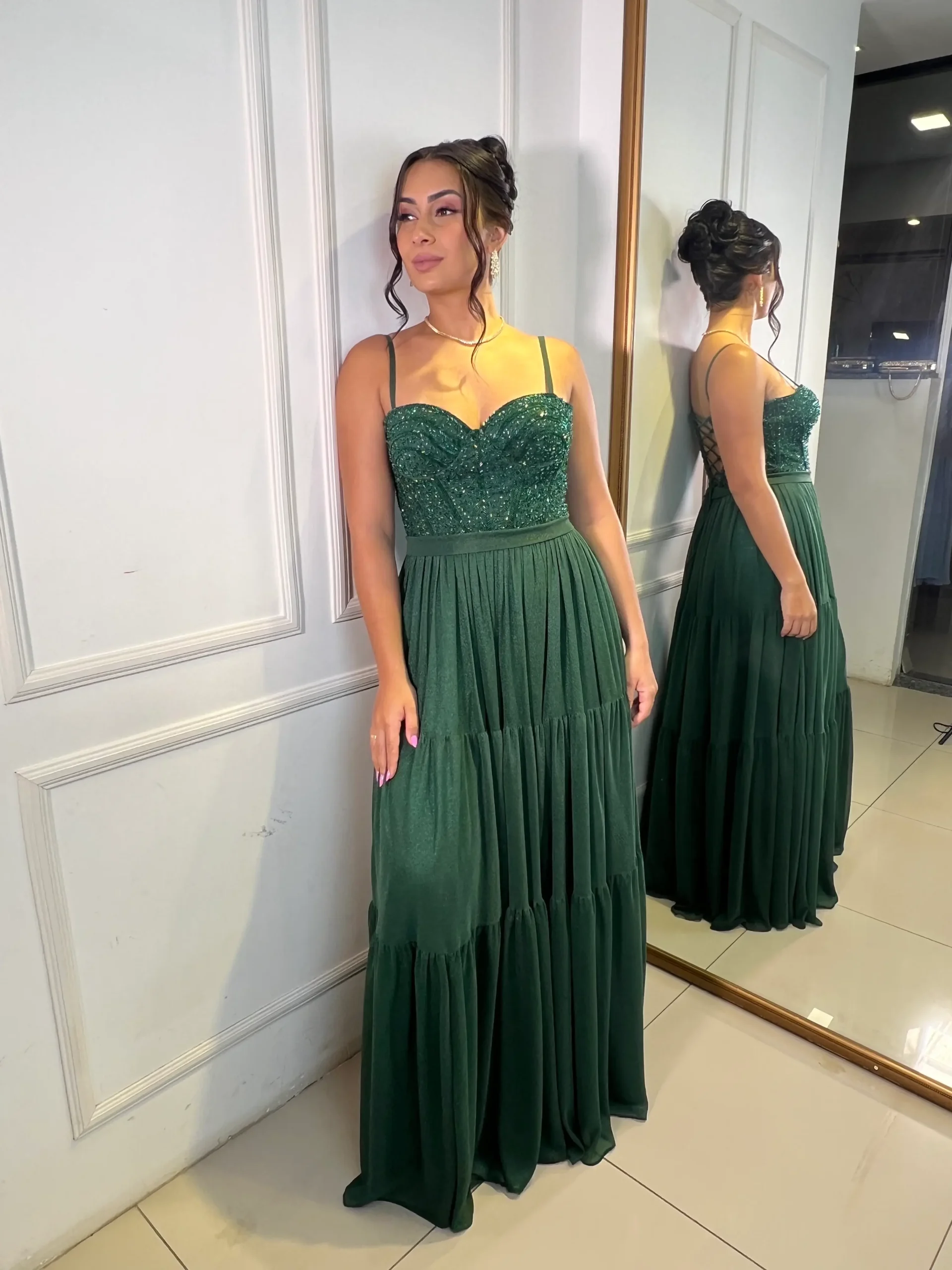 Corset com peito meia taça, ideal para aquelas com pouco busto, todo bordado com vidrilhos na mesma cor do vestido.
